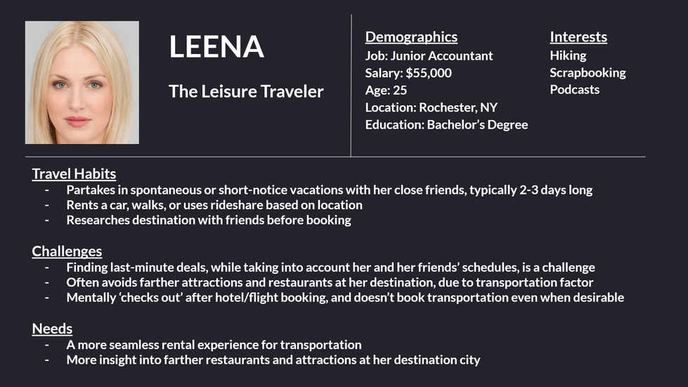 While honing my skills in user research and MVPs, within the Thinkful Product Management bootcamp, I developed a concept for a car rental product for the metasearch engine HotelTonight. After conducting strategic and competitive analyses, and considering the site's brand and market positioning, I conducted user interviews within HotelTonight's core demographic to craft two user personas. Then, with those personas in mind, I developed a minimum viable product for a car rental product that fit into the existing HotelTonight user flow, with realistic OKRs and success criteria.